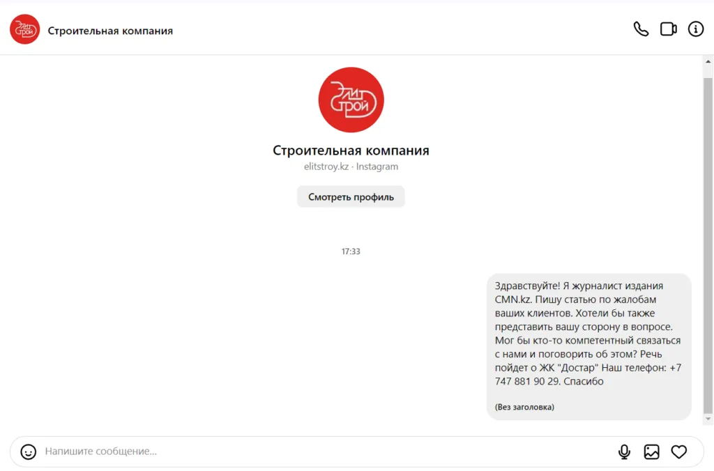 Корреспондент CMN.kz также обратился за информацией к застройщику. Сразу получить комментарий не удалось. Юрист компании отвечать на вопросы не захотела, но сказала, что переговорить с нами могут на месте строительства. Если быть точнее, нужно обратиться к «кому-то из отдела продаж». Журналист попытался связаться с отделом продаж ЖК, но и там сослались на некомпетентность в вопросе и тут же предложили контакты некой сотрудницы по имени Жансауле. К сожалению, и она не ответила. Написали мы в Instagram: