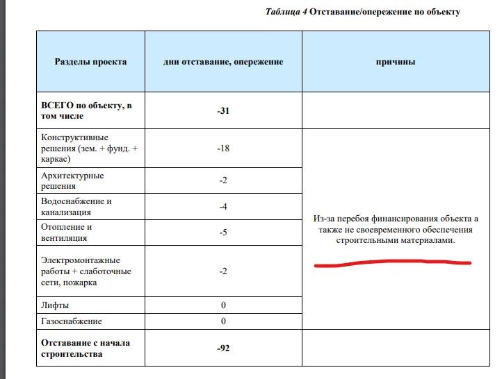 В одном из документов от 2022 года сотрудники проверяющей инжиниринговой компании действительно указывали, что у застройщика проблемы с финансированием объекта, а также с несвоевременным обеспечением строительными материалами.