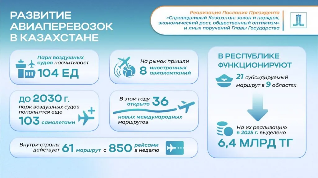 «В этом году открыто 36 новых международных маршрутов, на рынок пришли восемь иностранных авиакомпаний. Внутри страны действует 61 маршрут с 850 рейсами в неделю», — отметил вице-министр транспорта Максат Калиакпаров.