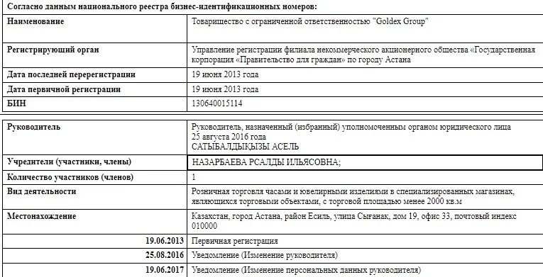 Предприятие Goldex Group зарегистрировано в Астане на улице Сығанақ, 19. Там же находится и медицинский центр "Мейрим".
