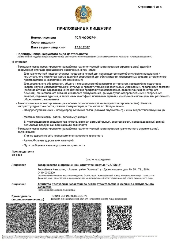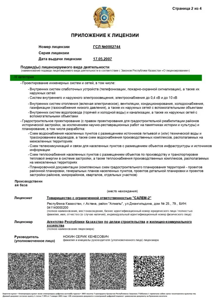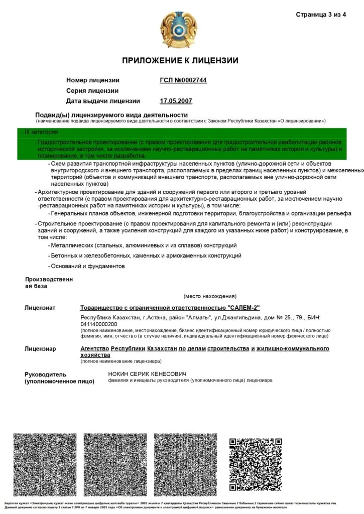 В 2007 году организация получила лицензию на строительно-монтажные работы ІІІ категории. Имея этот документ, ТОО может заниматься градостроительным, архитектурным и строительным проектированиями, а также многим другим.
