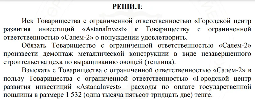 19 декабря 2022 года в Специализированном межрайонном экономическом суде Астаны решили, что иск AstanaInvest необходимо удовлетворить. ТОО "САЛЕМ-2" был обязано освободить участок от незавершенного строительства цеха по выращиванию овощей (металлический каркас теплицы). Из-за того, что в иске городской центр развития инвестиций не указывал никаких неустоек, то компании Назарбаевой было необходимо оплатить только госпошлину в размере 1 532 тенге.