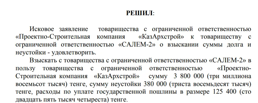 Компания-проектировщик подала иск в Специализированный межрайонный экономический суд Астаны. 22 января 2019 года суд решил удовлетворить заявление компании. С ТОО "САЛЕМ-2" взыскали 3,8 млн тенге и 380 тысяч тенге неустойки. Госпошлина составила 125 400 тенге.