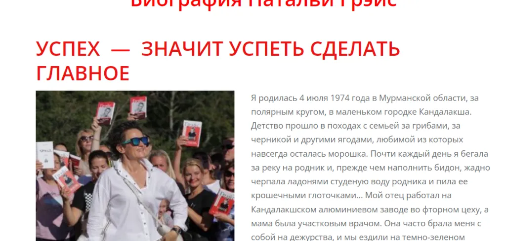 Речь идёт о россиянке Наталье Грэйс. В интернете она именует себя психологом, бизнес-тренером, писателем и коучем с миллионной аудиторией.