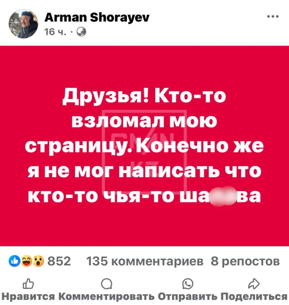 Общественник Арман Шораев опубликовал у себя на странице в социальных сетях пост, в котором говорится: