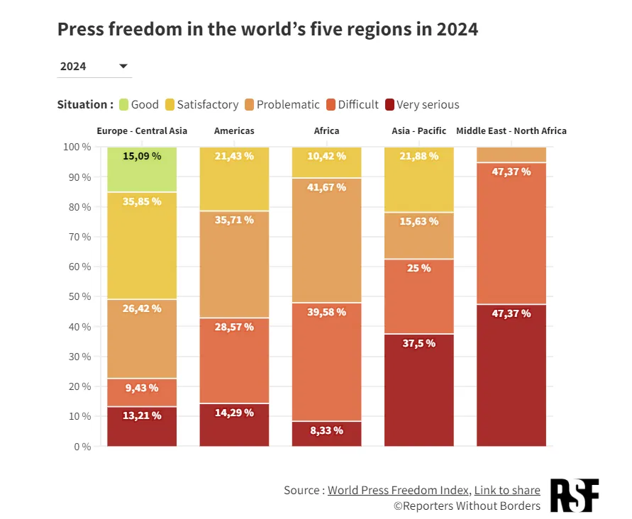 }}Согласно данным организации, ситуация со свободой СМИ ухудшается во всем мире. Растёт количество нападений на журналистов, а также число стран, где условия работы для сотрудников массмедиа становятся невыносимыми. Например, в прошлом году в 36 шести странах из выборки независимая журналистика оказалась практически невозможна. Это считается рекордом десятилетия.
