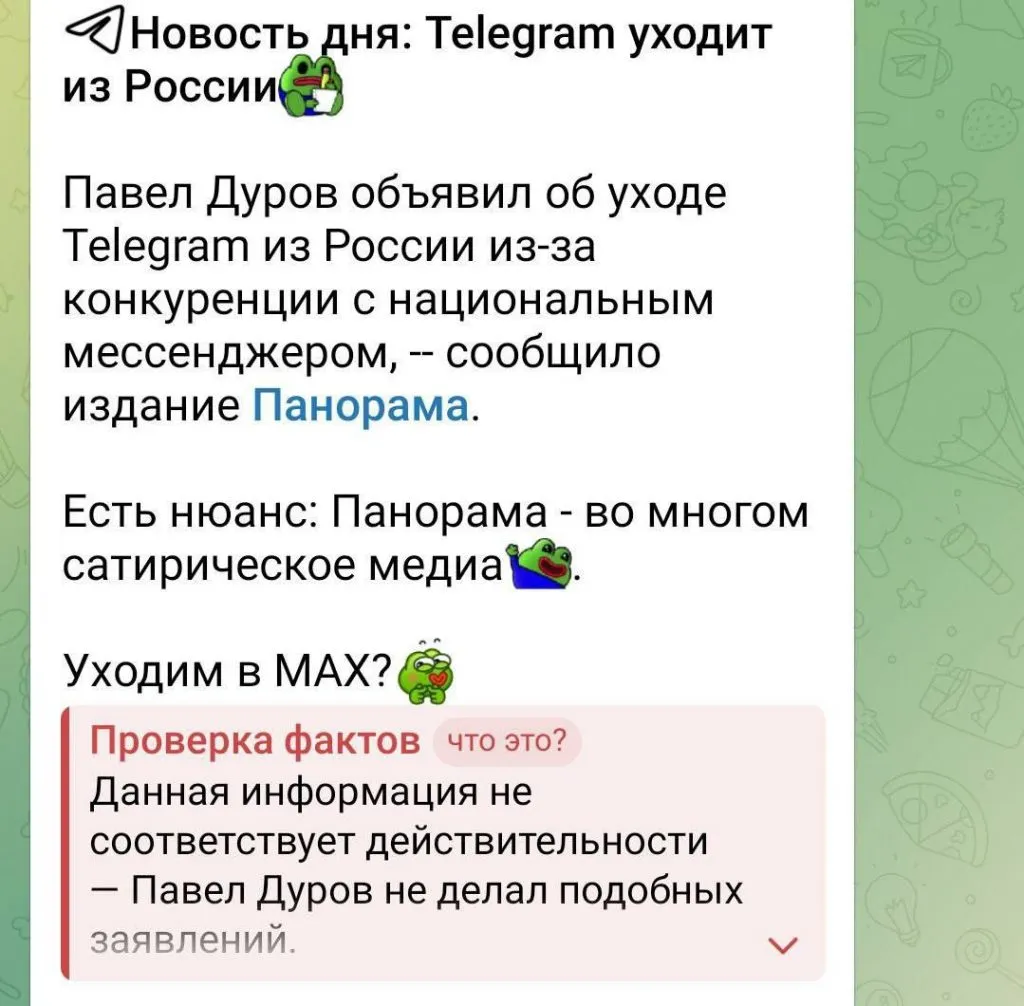Массовых проб еще не случилось. Однако один из Telegram-каналов уже опробовал новинку. Как пишет РИА Новости, канал опубликовал пост, в котором сообщается об уходе мессенджера из России. Об этом якобы объявил его основатель Павел Дуров. Мессенджер распознал эту информацию как ложную.