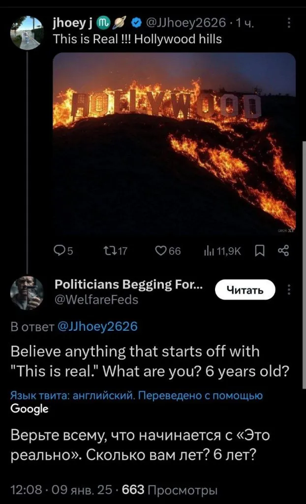 Фотографии с горящими буквами Hollywood, которые успели разойтись по всемирной паутине похоже оказались сгенерированы искусственным интеллектом.