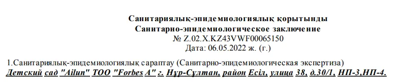 Возможной родственнице Альмиры Нурлыбековой принадлежит ещё и детский сад в Астане. Через ТОО Forbes A Айгерим Нурлыбекова управляла дошкольным учреждением Ailun по адресу: улица 38, дом 30/1. В соцсетях детсада последний пост был несколько лет назад – 29 августа 2022 года. При этом лицензии компания Forbes A получила в мае 2022 года.