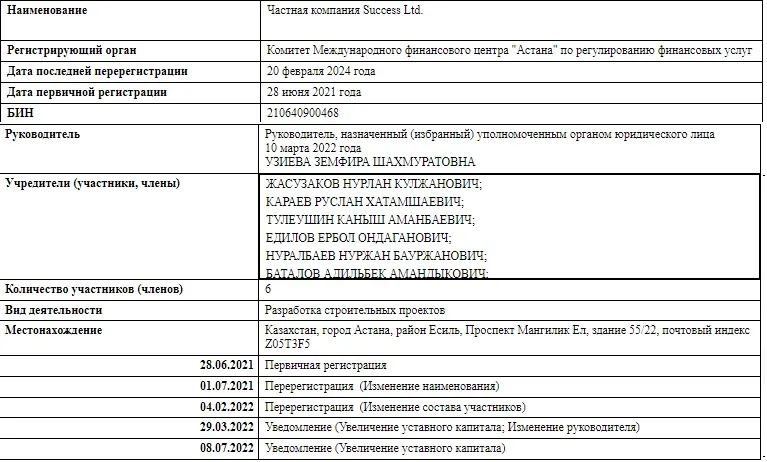 Занимается Частная компания Success Ltd разработкой строительных проектов. А зарегистрировали предприятие в международном финансовом центре "Астана". Компания интересна и другими учредителями.