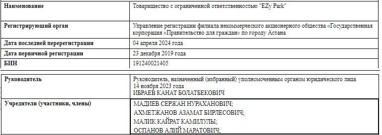 От актива мать подозреваемого в убийстве отказалась 14 марта 2024 года. В этот день её сменили сразу два новых человека – Кайрат Малик и Азамат Ахметжанов. Первый вице-министр цифрового развития, инноваций и аэрокосмической промышленности Каныш Тулеушин покинул компанию 4 апреля 2024 года. Вместо него никого нового не появилось. Скорее всего, его доля участия в ТОО «EZy Park» была передана одному из действующих совладельцев или даже нескольким.