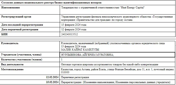 Кайрату Малику принадлежит несколько компаний (ТОО "СБ Меркур Секьюрити", ТОО "ШыгысИнСтрой", ТОО Gentleman Group и ТОО MAK Company), ещё в нескольких он значится директором. Особенно интересна совсем молодая организация – ТОО Heat Energy Capital. Её создали 12 февраля 2024 года. Учредителем предприятия значится некая Айгерим Муратовна Нурлыбекова. Предположительно, она сестра Султана Муратовича Нурлыбека, который проходил подозреваемым по делу о взятке Куандыка Бишимбаева. Heat Energy Capital продаёт широкий ассортимент товаров и уже пополнил казну государства на сумму более миллиона тенге.