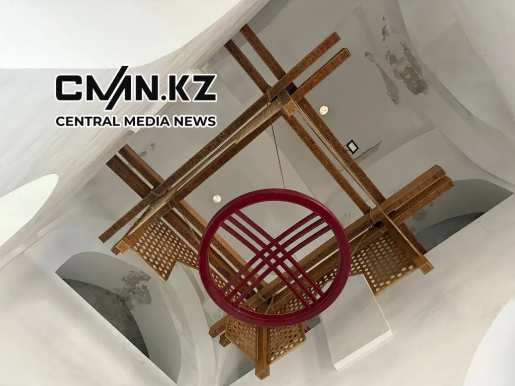 Тем не менее, увидеть зал всё же было возможно — пусть и не с привычного ракурса. Из одного из боковых помещений, открытых для посещения, сквозь арку можно было разглядеть внутреннее пространство Казандыка. Там шли работы: весь зал был застелен защитной тканью, пол укрыт, а вверх тянулись металлические строительные леса. Тайказан оказался в самом центре — ограждённый и частично накрытый.