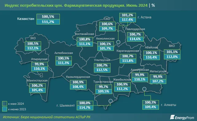 В годовой динамике фармацевтическая продукция подорожала во всех регионах. Сильнее всего цены выросли в Астане (на 17,4%), Шымкенте (на 14,7%) и Павлодарской области (на 14,6%).