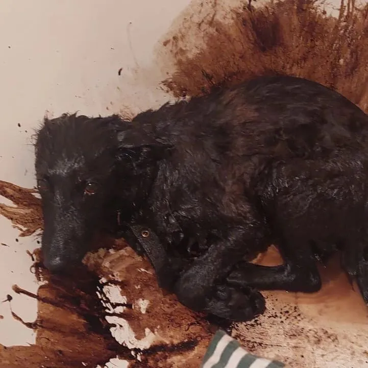 Общими усилиями им удалось вытащить собаку из ямы с вязким гудроном. Животное было измучено и истощено. Его доставили к ветеринарам, где сначала попытались отмыть, а затем состригли всю шерсть.