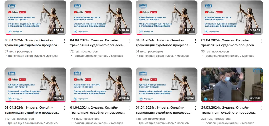 После вынесения приговора в Верховном суде рассказали, что YouTube трансляции дела Бишимбаева набрали 3,346 млн просмотров. Их общая длительность составила 119 часов 3 минуты 35 секунд.