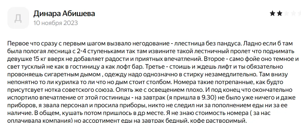 Так, Академическому оркестру казахских народных инструментов имени Дины Нурпеисовой были необходимы два номера «люкс» или «полулюкс» с 28 по 30 августа 2024 года в дни празднования Дня Конституции. Несмотря на контракт, им в гостинице Назгуль Тлегеновой отказали как раз из-за ремонтных работ и попросили расторгнуть с ними договор.