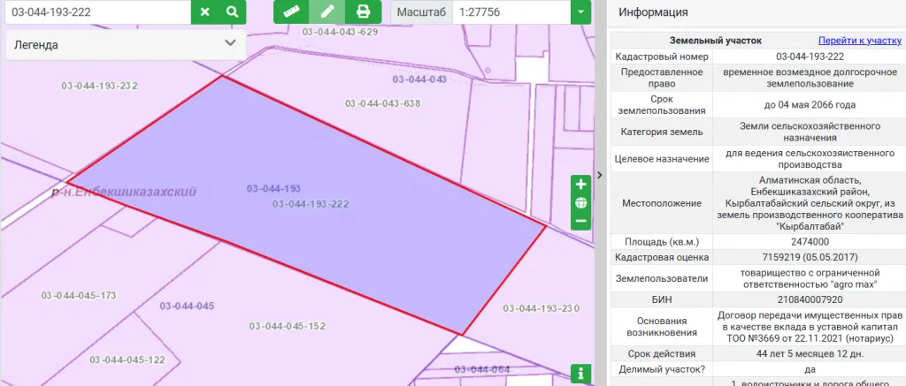 Третьим достаточно интересным бизнесом Назгуль Тлегеновой стало сельскохозяйственное ТОО "AGRO MAX", которое занимается выращиванием одно и двухлетних культур в Алматинской области. Предприятие даже арендовало у акимата Енбекшиказахского района участок в 247,4 га до 2066 года. Но по суду в сентябре 2023 года его вернули в госсобственность.