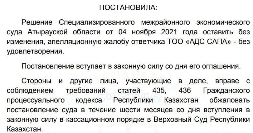 В Специализированном межрайонном экономическом суде Атырауской области 15 марта 2024 года отказали в удовлетворении иска. Заместитель прокурора региона решил, что коэффициент к дополнительным расходам за зимний период был необоснованно применён и уплачен, поэтому подал протест. Но в Атырауском областном суде снова отказали.