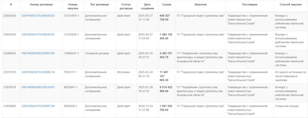 ТОО "БатысАльянсСтрой" на регулярной основе участвует в государственных закупках и выигрывает их. Суммы исчисляются миллионами и миллиардами тенге. Заказчиком выступают различные ведомства акимата Атырауской области. В 2025 году ТОО получило контракты через конкурс с использованием рейтингово-балльной системы.