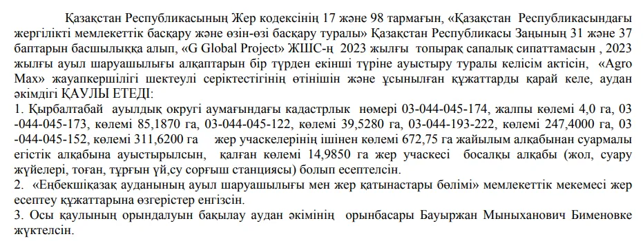 Компания жены депутата продолжает пользоваться ещё несколькими участками в производственном кооперативе "Кырбалтабай". В общей сложности ТОО использует для своих нужд более 1200 га земли. В июле 2023 года большую часть территории перевели из пастбищных земель в орошаемые пашни, а 14,985 га отнесли к землям запаса (дорога, оросительные системы, пруд, жильё, водонасосная станция).