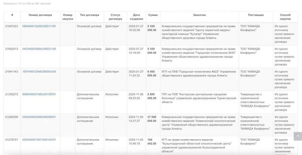 Тем временем заявление Юлии Блажновой о том, что организатором двух поездок за 2024-2025 годы действительно выступила одна и та же компания, подтвердили. В Управлении общественного здравоохранения Алматы сообщили, что второй год подряд медицинские организации заключают договор о госзакупках с ТОО «КАМАДА Конференс». Но в 2024 году поездка в Лос-Анджелес обошлась дешевле. Стоимость услуги составила 4,8 млн тенге за одного человека.