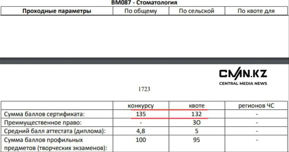 В национальном центре тестирования корреспонденту CMN.KZ пояснили, что минимальный балл по специальности «Стоматология» начинался от 135 для общего конкурса и от 132 для сельской квоты.