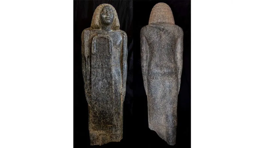 Слева от него находятся две безголовые статуи. Перед ними была обнаружена еще одна перевернутая статуя из черного гранита высотой около 1,35 метра. Предполагается, что это статуи фараона Джосера (основателя III династии), его жены и их десяти дочерей.