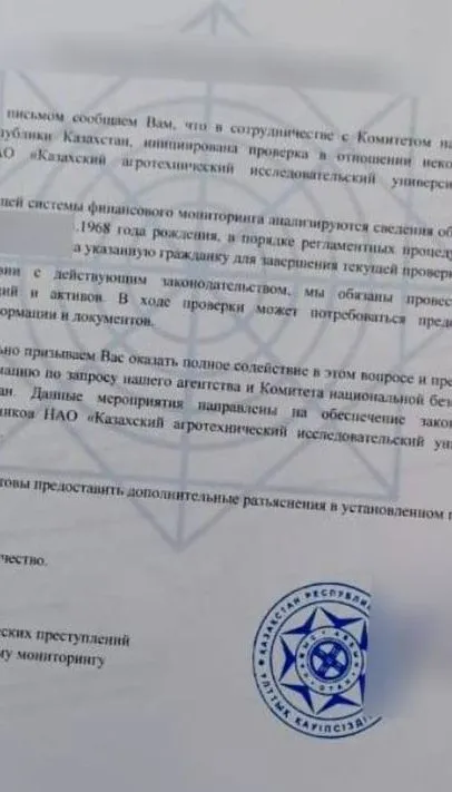 "Для большей убедительности оповещение составляется на поддельном бланке с логотипом АФМ, скреплённом фальшивой печатью КНБ. Затем перезванивают агенты, представляясь сотрудниками АФМ, и выманивают сведения о банковских счетах", – сообщили в ведомстве.