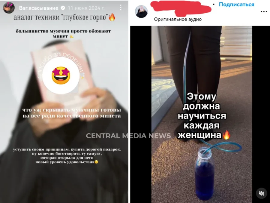 Далее Шайх выложила наглядный пример того, как на практике выглядит обучение той самой «гимнастке». На кадрах девушка в откровенном наряде с помощью трубочки, погружённой в внутрь гениталий, всасывает из баночки мёд. Её подбадривает женщина в платке. Имя аккаунта блогер скрыла.
