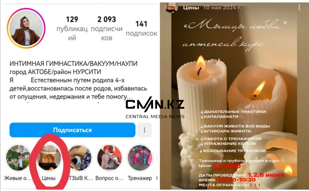 Далеко ходить не надо. По одной из ссылок в Instagram некая покрытая дама предлагает женщинам избавиться от серьёзных проблем после родов. Стоит её курс 55 тысяч тенге. Прайс на услуги прошлогодний, зато «трубочка идёт в комплекте». Идут ли в комплекте сертификаты о квалификации и безопасности техник — неизвестно.
