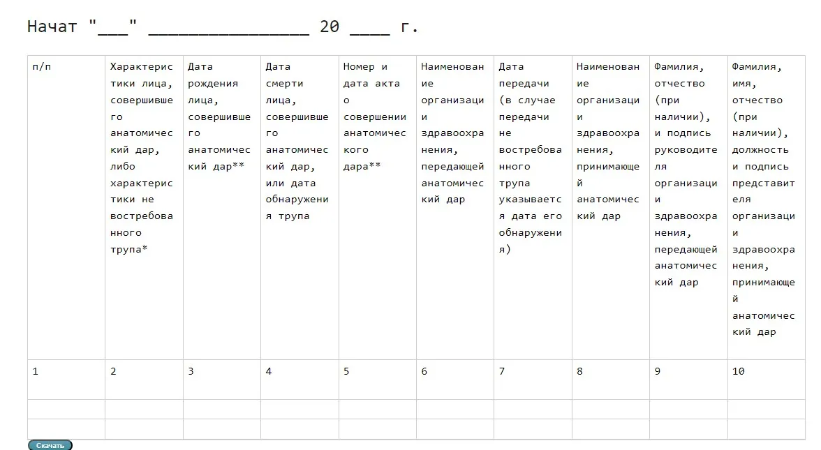 Вопросом передачи органов или тканей трупов тех, кто добровольно на это согласился, занимается специальная комиссия. Акт составляют по следующей форме: