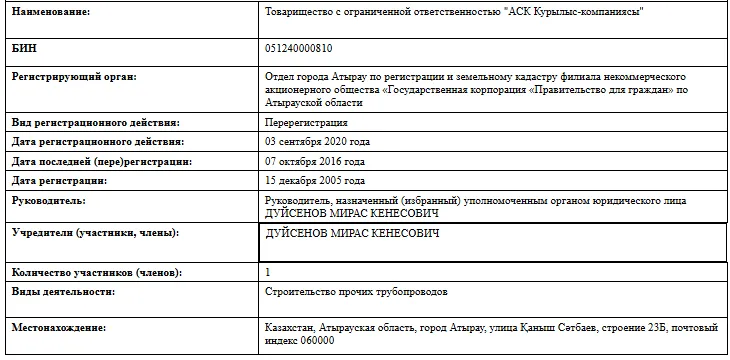 Что касается места регистрации, то организация переехала из Актобе в Атырау. По всей видимости, это было необходимо для участия в тендере, потому что участок для замены труб находился именно в Атырауской области.