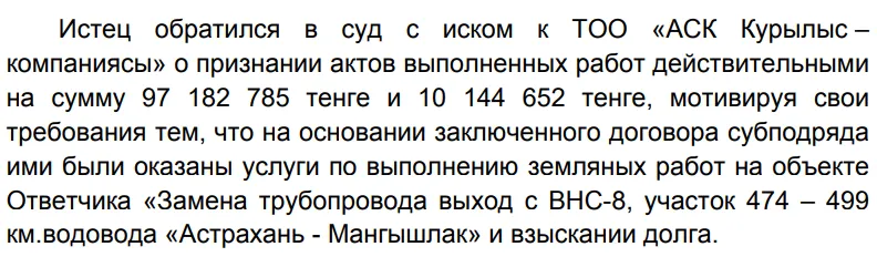 Но в итоге стороны не смогли договориться. Компании Gaz Stroy montazh kz не подписали два акта выполненных работ на 97,1 млн тенге и 10,1 млн тенге. Для того, чтобы разрешить ситуацию, руководство компании-субподрядчика обратилось в суд.