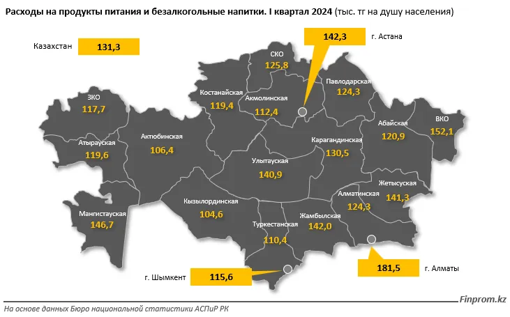 Меньше всего потратили на еду и напитки жители Кызылординской, Актюбинской и Туркестанской областей — 104,6 тыс., 106,4 тыс. и 110,4 тыс. соответственно.