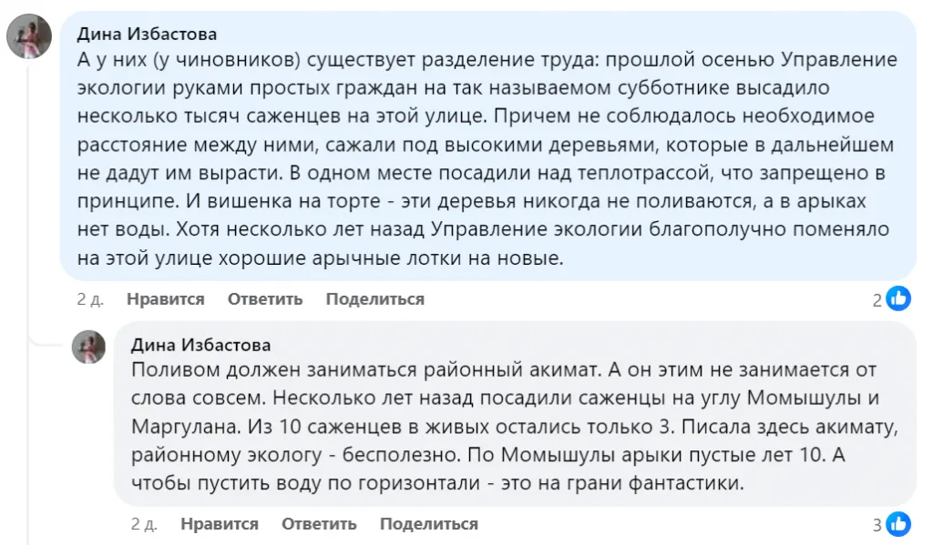 «Ауезов Ауданы осенью насадили чудесных саженцев акации, они все принялись и даже цвели весной. Но настала жара, и без полива всё стало сохнуть и желтеть. Пожалейте свой труд и растения, организуйте, пожалуйста, полив. Улица Маргулана, между Саина и Момышулы»,