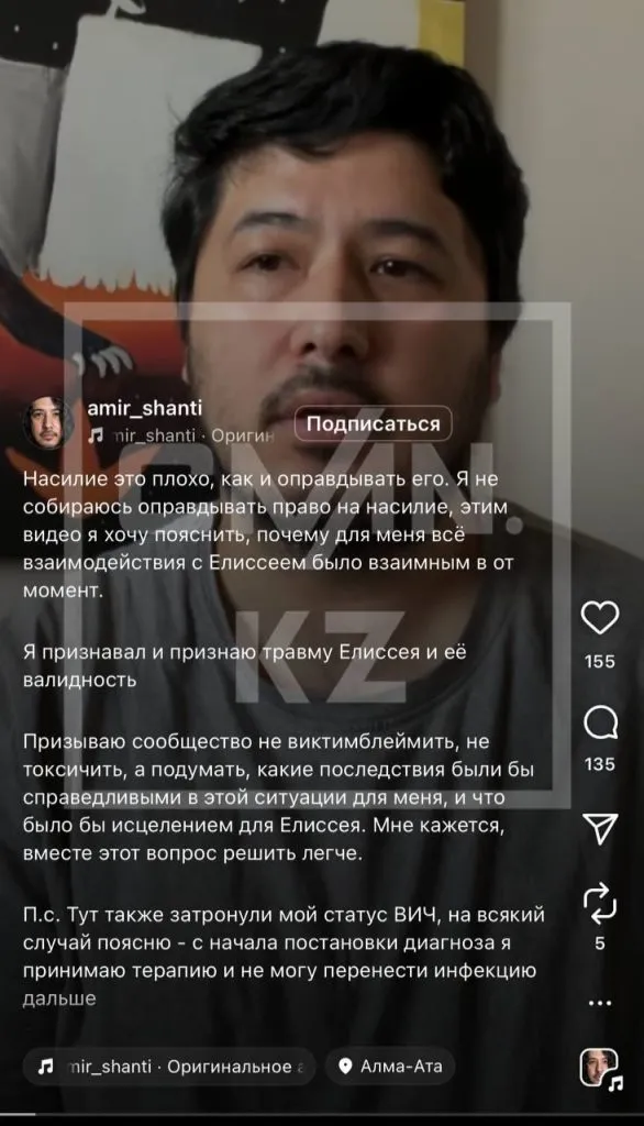 На своей странице в Instagram Амир Шайкежанов опубликовал ответное видео и подтвердил, что те записи, которые Елиссей приводит с камер наблюдения, правдивы.