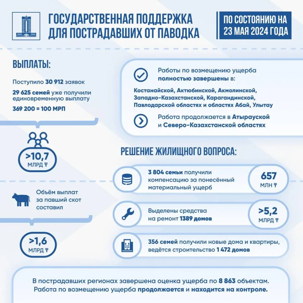Оценщики успели осмотреть 8 863 объекта. 356 семей получили новые дома и квартиры. Ведется строительство 1 472 домов. Более 5,2 млрд тенге выделено на проведение ремонтных работ в 1 389 домах. 3 804 семьи получили компенсацию за понесенный материальный ущерб на общую сумму в 657 млн тенге.