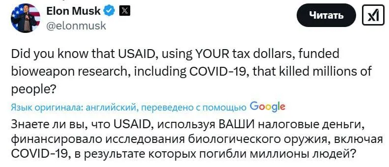 «Знаете ли вы, что USAID, используя ваши налоговые отчисления, финансировало исследования в области биологического оружия, включая COVID-19, от которого погибли миллионы людей?» — написал он в социальных сетях.