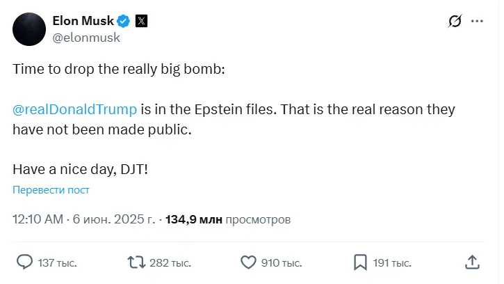 Окончательно ясно, что между Трампом и Маском всё не ладно, стало после того, как бизнесмен заявил: фамилия нынешнего президента фигурирует в списках Эпштейна. Том самом, где числятся гости, посещавшие элитный курорт-бордель, использовавший несовершеннолетних девочек.