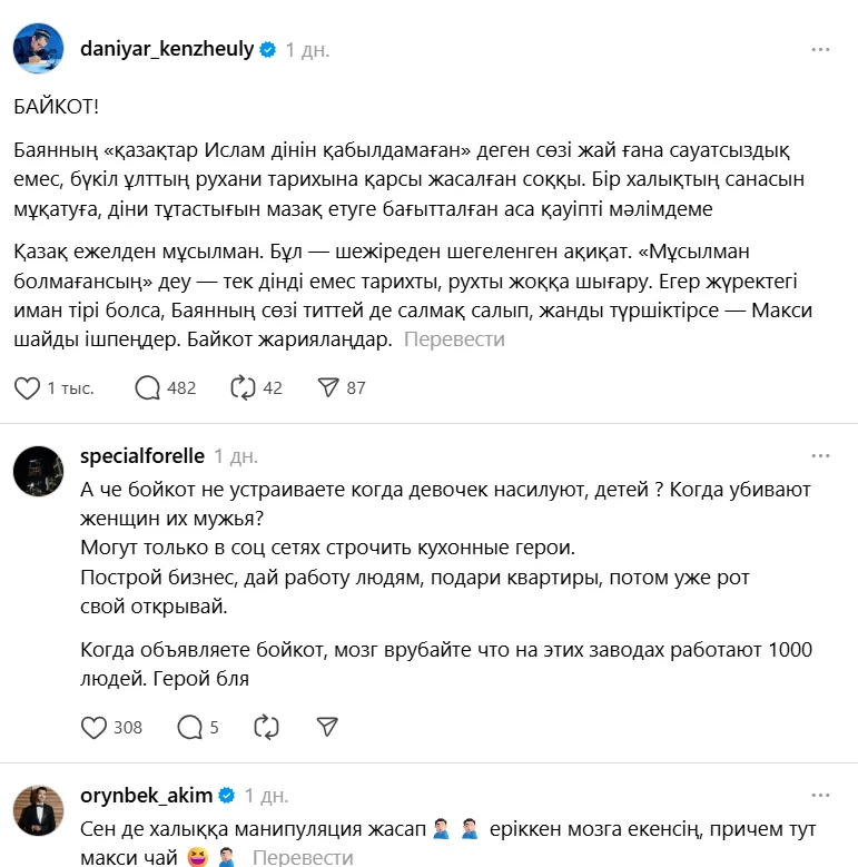 «Почему вы не объявляете бойкот насильникам?», «Женщин убивают, детей насилуют — это никого не шокирует. Бедность и коррупция — норма. А тут сказали, что казахи не были мусульманами с самого начала — всё, бойкот!» — написали пользователи.