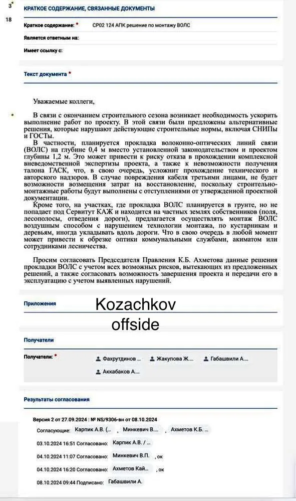 Автор документа предупреждает, что подобный вариант может не устроить госструктуры или коммунальные службы, поэтому он якобы просит председателя правления Freedom Telecom Кайрата Ахметова согласовать данные действия. В файле напротив фамилии топ-менеджера стоит «Ок». То же самое и напротив фамилии гендиректора ТОО Freedom Telecom Владислава Минкевича.