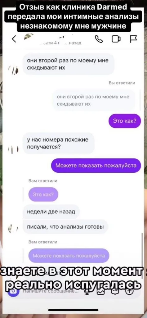 Из скриншотов переписки, предоставленной Асанхановой, следует, что о готовности результатов её анализов мужчине написали ещё две недели назад. В итоге клиника прислала документ ему же. А когда он ответил, что не знает, кому принадлежит результат исследования, судя по всему, файл удалили. После мужчина не поленился найти девушку в сети и написать ей. В переписке он предположил, что у них с пациенткой просто похожие номера и в Darmed ошиблись при рассылке.