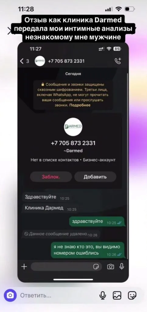 Весной 2024 года произошла скандальная ситуация с утечкой интимных данных студенток КазНУ им. Аль-Фараби. Тогда в случившемся обвинили медсестру центра Smart Health University City, который проводил осмотр учащихся. Виновных со стороны вуза и со стороны центра уволили, и история как-будто бы забылась. Однако недавно в соцсетях в похожем контексте всплыло имя уже совсем другой клиники. Речь идет об алматинском медцентре Darmed. Одна из пользовательниц Instagram обвинила центр в сливе результатов своих интимных анализов. Девушка потребовала от Darmed компенсацию, но там смогли предложить только бесплатную консультацию. В конфликте между пациенткой и медучреждением разбирался корреспондент CMN.KZ