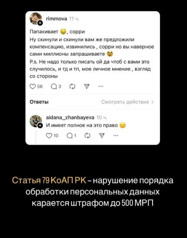 Сама пользовательница не говорит в своих публикациях, о какой сумме компенсации идёт речь и не упоминает, что она её вообще запрашивала. Однако тут же благодарит в Stories своего юриста, который «консультировал её».