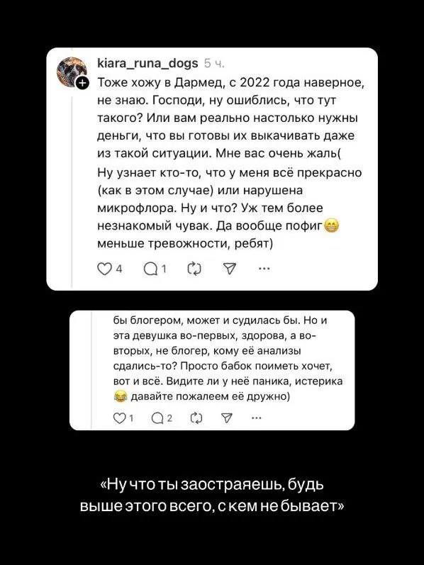 «То есть они предлагают мне ещё раз прийти, когда у меня уже нет доверия к ним? Это нормально, что Darmed считает, что утечка данных их пациентов стоит, как один поход к их врачу? И знаете, что самое обидное? Я была их суперлояльным клиентом с 2023 года. Я их бесплатно рекламировала в Stories, потому что действительно всегда делюсь от души классными рекомендациями», — пишет девушка.