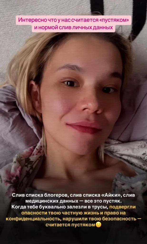 «Он написал: “Клиника Darmed отправила мне ваши анализы, вы абсолютно здоровы.” Это были мои интимные анализы на инфекционные заболевания. И знаете, в этот момент я реально испугалась. У меня просто начались паника и истерика. А что, если бы этот человек слил мои анализы, например, на мою работу или моим друзьям? А что, если бы он их подделал? Я, конечно, сейчас фантазирую, но вы представьте, насколько это было абсурдно! Я почувствовала себя абсолютно уязвимой», — рассказала девушка.