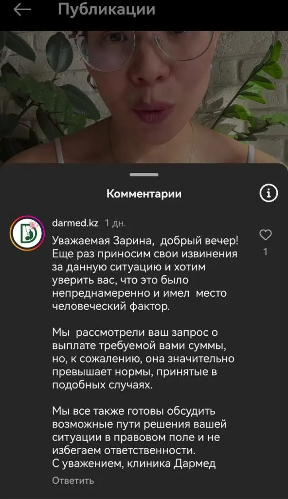 Тем временем под постом Асанхановой официальный аккаунт Darmed оставил комментарий, в котором клиника приносит свои извинения. Однако тут же отмечает, что сумма компенсации, которую запрашивает девушка «значительно превышает нормы принятые в подобных случаях».