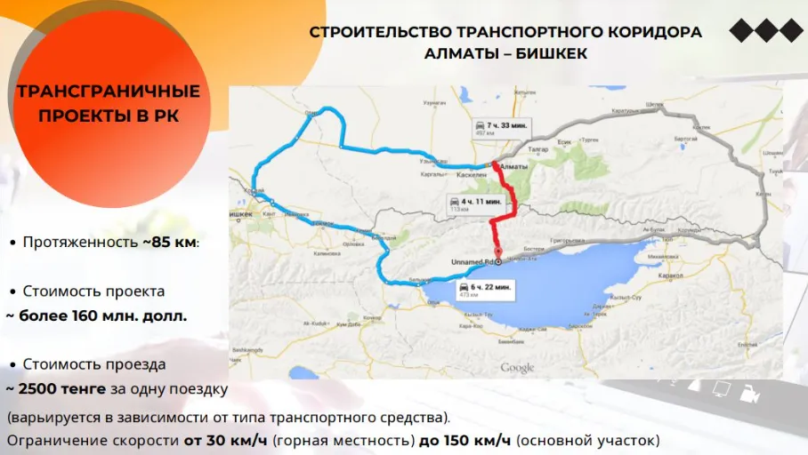 Сейчас дорога, соединяющая два государства занимает 485 км. Она проходит по таким населённым пунктам, как «Алматы – Отар – Кордай – Бишкек – Чолпон-Ата». Чтобы сократить время в дороге, правительства Казахстана и Кыргызстана рассматривают строительство альтернативного маршрута: «Алматы – Узынагаш – Кечи-Кемин». Предварительная протяжённость дороги составит всего 70-80 км, из них на территорию Кыргызстана придётся шесть километров.