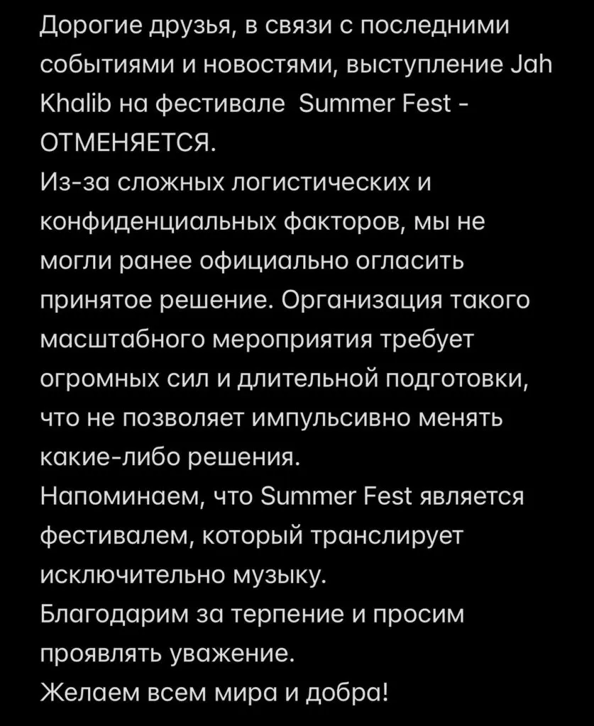 Дорогие друзья, в связи с последними событиями и новостями, выступление Jah Khalib на фестивале Summer Fest - ОТМЕНЯЕТСЯ! Из-за сложных логистических и конфиденциальных факторов, мы не могли ранее официально огласить принятое решение. Организация такого масштабного мероприятия требует огромных сил и длительной подготовки, что не позволяет импульсивно менять какие-либо решения. Напоминаем, что Summer Fest является фестивалем, который транслирует исключительно музыку,